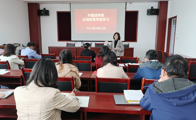 4月12日,外语学院于文理大楼211开展纪律教育专题学习,学院班子成员、各支部书记、各系室主任和全体辅导员参加学习。