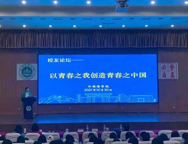 10月30日,外语学院在泮河校区图信楼报告厅举办校友论坛,2013届优秀校友、济南市莱芜区区委宣传部孙飞飞作报告,学院学生工作负责人、辅导员及2021级全体新生参加论坛。
