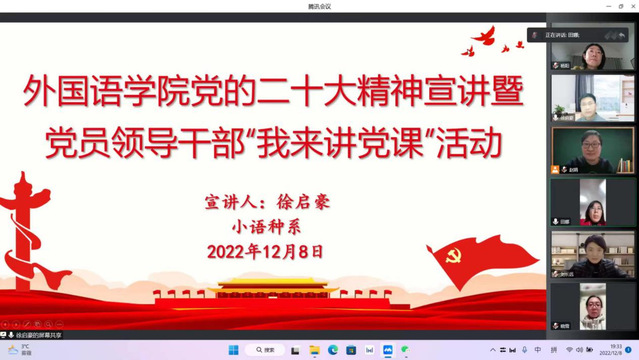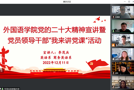 12月8日至11日,外语学院党委组织班子成员深入各系室、党支部开展党的二十大精神宣讲暨党员领导干部“我来讲党课”活动。