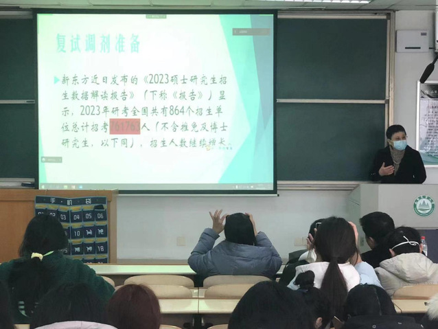 会上,院长翟红华从形势分析、复试和调剂指导3个方面展开详细讲解。她介绍说,2023届高校毕业生数量达到1158万人,比前一年增加了82万,再次刷新历史新高。她引导学生要认清形势,在挑战中把握机遇。她详细分析复试流程,提醒考生注重口语练习,有针对性投入复试准备。对于调剂,她建议考生根据个人实际情况,时刻关注调剂信息,抢抓机遇,积极选择调剂学校,不放弃任何一个机会。