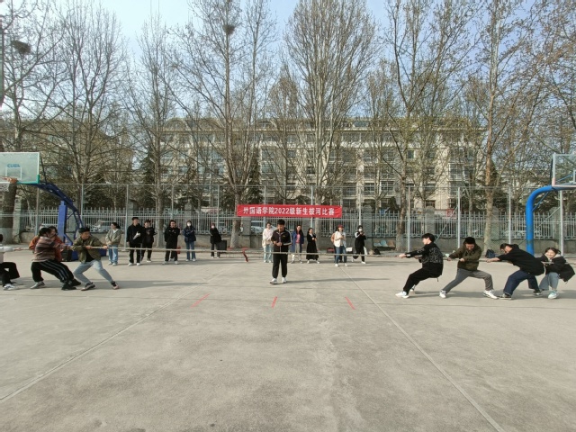 3月28日,外语学院在泮河校区排球场举办2022级新生拔河比赛,引导学生走下网络、走出宿舍、走向操场。学院学生工作负责人、全体辅导员和2022级全体学生参加活动。