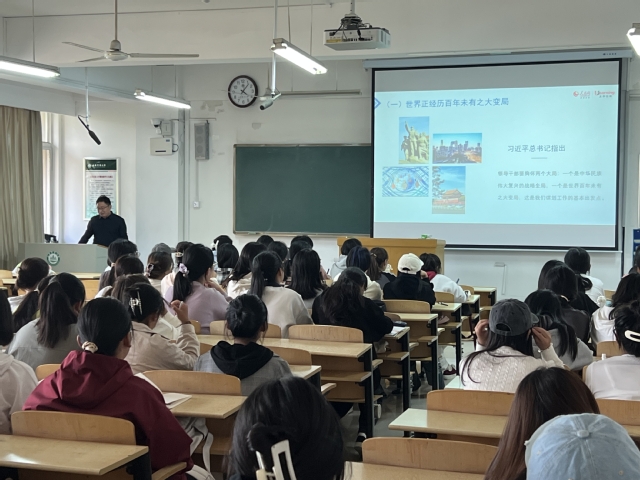 10月7日,外语学院党委书记胡化坤在泮河校区综合楼S219,面向新生作“当前的国际形势与我国周边安全形势”专题形势与政策讲座,2023级商务英语专业学生及辅导员参加活动。