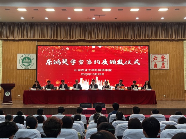10月28日下午,首届“东鸿”奖学金签约及颁奖仪式在泮河校区图信楼报告厅举行,学校党委常委、统战部部长、台港澳事务办公室主任史文宪,外语学院2002级校友、浙江东鸿电子股份有限公司董事长王桢和总经理周建川参加仪式并为获奖学生颁奖。
