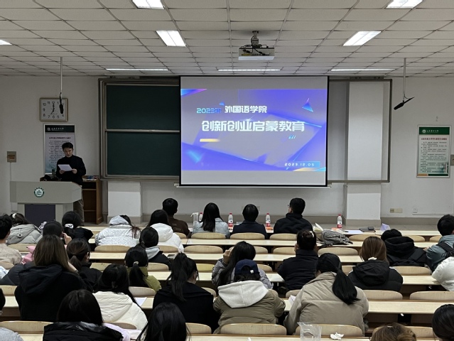 12月5日,外语学院在泮河校区综合楼N104开展创新创业启蒙讲座,邀请学院翟红华老师,食科学院王文良老师、博士生高山同学出席。外语学院部分学生参加讲座。