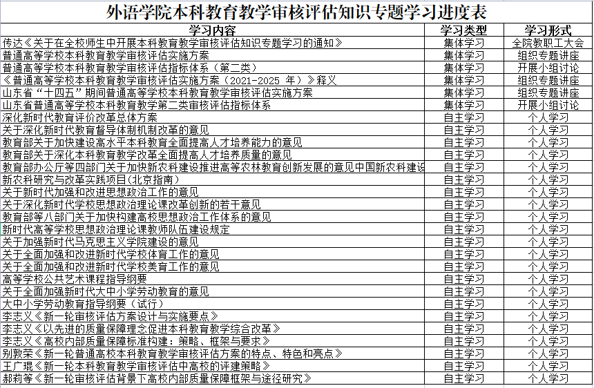 学院本次专题知识学习工作取得良好效果。通过学习,学院师生深入学习了审核评估应知应会知识点和各自的职责要求,充分认识到本科教育教学审核评估工作的重要意义。师生表示通过对本科教育教学审核评估知识的行学习,认识到本科教育教学审核评估中关于教育评价改革,教育督导改革等是从国家层面对新时代评估做出的方向性、全局性和战略性的制度安排,并表示利用此次评估,提高个人教学育人和专业学习能力,不断提升个人水平,为学校决战“十四五”、决胜“冲一流”贡献外语学院力量。